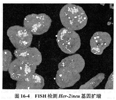 【检测方法】检测Her-2/neu基因的扩增和过表达的方法有FISH和免疫组织化学(IHc)法。FISH法是用不同的荧光物质分别标记Her-2/neu基因探针(红色)和第17号染色体中性粒探针(绿色),原位杂交后荧光显微镜下观察荧光信号,计数一定细胞,计数红、绿比值。Her-2/neu基因扩增时,红、绿荧光点比值>2(图16-4)。也可用酶联免疫法直接检测血清中的Her-2/neu蛋白。