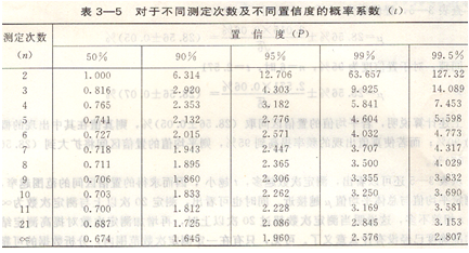 t――在选定的某一置信度下的概率系数,可根据测定次数从表3―5中查得。