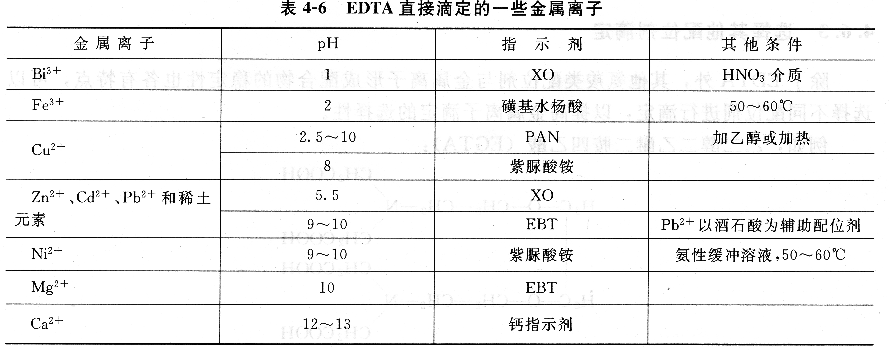 直接滴定法操作简单,一般情况下引入的误差较少,因此只要条件允许,应尽可能采用直接滴定法。表列出了EDTA直接滴定一些金属离子的条件。