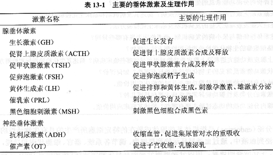 1、垂体分泌的激素 垂体从组织学上可分为神经垂体和腺垂体,分泌的激素相应地分为神经垂体激素和腺垂体激素,这些激素均为肽或糖蛋白。表13-1概括了重要的垂体激素及主要的生理作用。