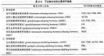 2、下丘脑激素 下丘脑一些特化神经细胞可分泌多种控制腺垂体激素释放的调节性激素,借助垂体门脉系统,下丘脑分泌释放的调节激素,可直接输送至腺垂体迅速发挥作用。目前已知的下丘脑调节激素大多是呈间歇式或脉冲式分泌的多肽类激素。按功能的不同,可分为释放激素与抑制激素,该类调节激素的种类、功能见表13-2。从表13-2中司看出下丘脑激素的名称即表示其作用,但也存在某些交叉。如促甲状腺激素释放激素(TRH)还促进GH、FSH等释放,而生长激素抑制激素(GHIH)也抑制腺垂体释放TSH、ACTH。