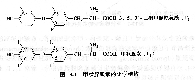 和三碘甲腺原氨酸(3,5,3’-triiodothyronine,T3),两者均为酪氨酸含碘衍生物。甲状腺激素的化学结构见图13-1。