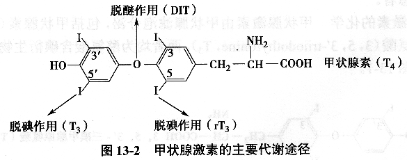 甲状腺激素的代谢主要为脱碘反应。T4是有生物活性的T3的前体,在肝、肾及其他组织中存在的脱碘酶催化下,T4分别在5’(外环)或5位(内环)脱碘,生成T3和无活性的3,3’, 5’-三碘甲腺原氨酸(reverse triiodothyronine,rT3),即反T3(图13-2)。血液中的T3近80%来自T4外周脱碘。T3及T4还可进一步脱碘为二碘甲腺原氨酸。此外,T3和T4还可通过脱氨基、羧基,以及和葡萄糖醛酸、硫酸根结合等方式代谢,结果是增加水溶性,有利于甲状腺激素从肾及胆道排泄。
