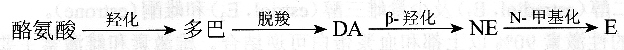 儿茶酚胺类激素均以酪氨酸为原料,经下列酶促反应生成。由于不同组织、细胞中酶种类及活性的差异,分别合成NE、E或DA。