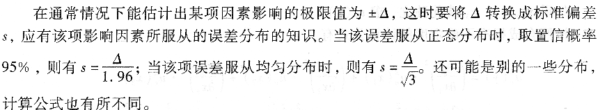 当误差限是由证书或其他说明书中得到,且没有明确给出确定的置信水平;当估计的误差限是以最大范围形式给出的,且没有对该误差的分布状况方面的知识时;当误差的性质偏重于系统性的误差时,建议按均匀分布处理。