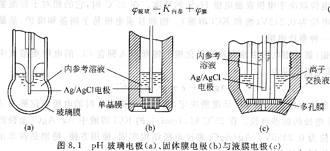 当玻璃电极外膜与待测溶液接触时,由于溶胀层表面与溶液中的氢离子活度不同,氢离子便从活度大的相向活度小的相迁移。从而改变了溶胀层和溶液两相界面的电荷分布,产生外相界电位。玻璃电极内膜与内参考溶液同样也产生内相界电位。玻璃电极内部插有内参比电极,如银/氯化银电极,因此整个玻璃电极的电位应是内参比电极与膜电位之和: