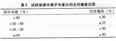 9.5.4.4试样溶液中的离子丰度比应与校正溶液的一致,容许偏差符合表5的要求。