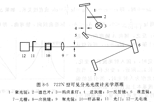 常见的国产722N型可见分光光度计采用光栅自准式色散系统和单光束结构光路,光路结构如图8―5所示。