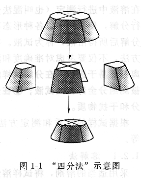 大块矿样先用压碎机破碎成小的颗粒,再进行缩分。常用的缩分方法为“四分法”(图1-1)。