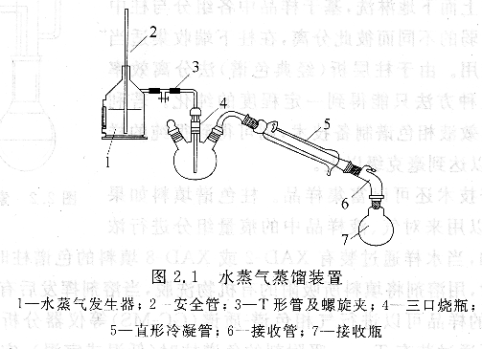 图2.1是水蒸气蒸馏所用的装置,它由水蒸气发生器和普通的蒸馏装置组成。被分离的样品置于三口蒸馏瓶中,水蒸气由水蒸气发生器进入蒸馏瓶,达到沸腾温度后,待测有机物随水蒸气一起蒸馏出来。