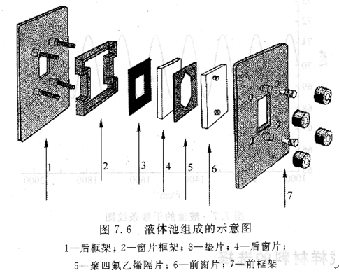 如图7.6所示,液体池是由后框架、窗片框架、垫片、后窗片、间隔片、前窗片和前框架7部分组成。一般地,后框架和前框架由金属材料制成,前窗片和后窗片为氯化钠、溴化钾、KRS一5或ZnSe等晶体薄片,间隔片常由铝箔或聚四氟乙烯等材料制成,起着固定液体样品的作用,厚度为0.01~2mm。