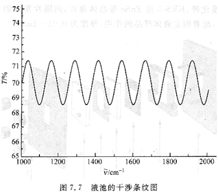 根据均匀的干涉条纹的数目可测定液体池的厚度。测定的方法是将空的液体池作为样品进行扫描,由于两盐片间的空气对光的折射率不同而产生干涉。根据干涉条纹的数目计算池厚(见图7.7)。一般选定1500~600cm-1的范围较好,计算公式如下: