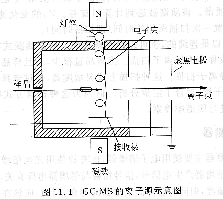 离子源的作用是将化合物电离得到其离子,它主要由电离盒、灯丝和电子接收极组成。图11.1是GC-MS的离子源示意图。