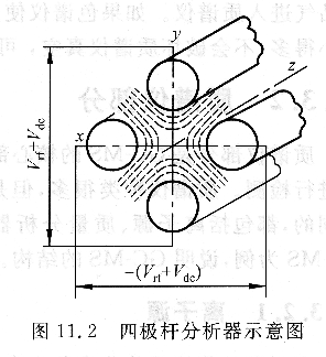 用于质谱仪的质量分析器种类很多。GC-MS的质量分析器多用四极杆分析器,也有使用离子阱或飞行时间分析器的。HP5973使用的是四极杆分析器。它由4根棒状镀金陶瓷电极组成。相对两根电极施加龟压(Vdc+Vrf),另外两根电极施加电压-( Vdc+Vrf)。其中Vdc为直流电压, Vrf为射频电压。4个棒状电极组成一个四极电场。四极杆分析器的示意图如图11.2所示。