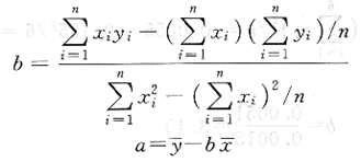 设浓度x为自变量,某特征参数了为因变量,在x与y之间存在一定的相关关系,当用实验数据xi和yi绘图时,由于测量仪器本身的精度以及测量条件的微小变化等都会给测量带来误差,因此用各测量点的测量值绘图就不可能全部在一条直线上,而是分散在直线的周围。为了找出一条直线,使各实验点到直线的距离最短,即误差最小。需要用数理统计方法,利用最小二乘法计算出相应的方程yi=a+bxi后再绘出相应的直线,这样的方程称为y对x的线性回归方程,相应的直线称为回归直线,从回归方程或回归直线上求得的数值,误差小,准确度高。式中的a为直线的截距,与系统误差大小有关;b为直线的斜率,与方法灵敏度有关。