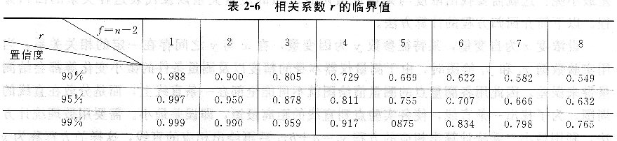 r的临界值与置信度及自由度有关,如表所示。如果计算的r大于表上相应数值,则表示所求的回归直线方程有意义;反之,则无意义。