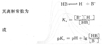 由测得的溶液的pH、AHB、AB-和A,就可算出一元弱酸HB的离解常数。对于弱碱也有类似的算法。