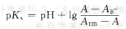 根据式(6.6),只要知道溶液的pH值和[HB]/[B一],就可以计算出离解常数Ka。pH值可用pH度计,[HB]和[B一]可从溶液的吸光度获得。对于浓度为c的一元弱酸,可以准备3种溶液:一种是强酸性溶液,此时可以认为溶液中全部以HB形态存在,溶液的吸光度AHB为: