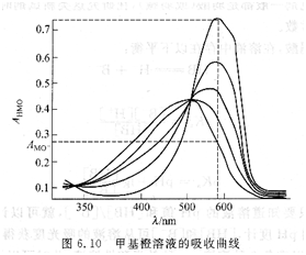 在某一浓度下,不同pH值的溶液中,甲基橙有图6.10所示的吸收光谱。最高曲线为酸式(HMO)的吸收曲线,最低曲线为碱式(MO-)的吸收曲线,其他曲线为HMO和MO-共存时的曲线,它们的形状与溶液的pH值有关。从图6.10可以得到AHMO和AMO一,以及不同pH值时所对应的A值,代人式(6.13),得到一组Pka值,取其平均值。