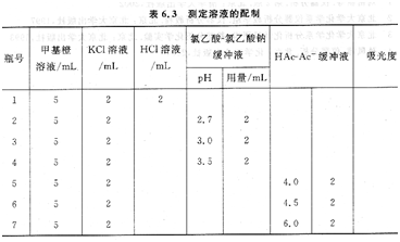 取7个50mL容量瓶,编号,按表6.3制备测定溶液。用水稀释至刻度,摇匀,用pH计精确测定溶液的pH值。