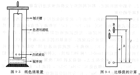 将试样点在滤纸的一端,并将该端浸在展开剂中(图9―3),由于毛细作用,流动相自下而上不断上升,经过试样点时,带动试样向上运动,被分离的各组分将在固定相(水相)和流动相(有机相)之间不断进行分配和再分配,分配比大的组分上升得快(图9―4,B组分),分配比小的组分上升得慢(图9―4,A组分),从而不同组分将会得到分离。如果这些组分显色,将会在滤纸上显现出若干个分开的色斑。