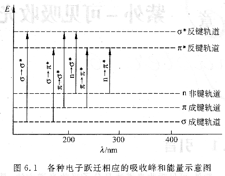 有机化合物的紫外-可见吸收光谱取决于有机化合物分子的结构。从化合物的性质来看,与紫外-可见吸收光谱有关的电子跃迁是n→σ*、n→π*和π→π*。图6.1定性地表示了各种类型的电子跃迁所需能量和吸收波长的位置。