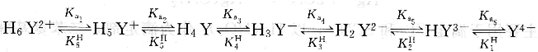 H4Y在强酸性介质中,两个羧基可以再接受H+,形成相当于六元酸的结构,以H6 Y2+表示,存在六级解离平衡,即: