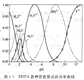 从图可以看出,不论EDTA的原始存在形式是H4Y还是Na2H2Y,在pH<1的强酸性溶液中,EDTA主要以H6Y2+形式存在;在pH=1~1.6的溶液中,主要以H5Y+形式存在;在pH=1.6~2.0的溶液中,主要以H4Y形式存在;在pH=2.O~2.67的溶液中,主要以H3 Y-形式存在;在pH=2.67~6.16的溶液中,主要以H2Y2一形式存在;在pH=6.16~10.26的溶液中,主要以Y4一形式存在。